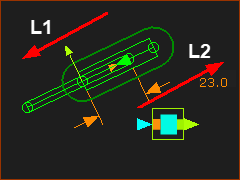 •Line 1 – L1 in the Base-Part - Drag down from the right •CAD-Line/Part 2 – L2 - Drag up from the left The Motion-Dimension is 23mm. If you increase the Motion-Dimension value, you move the Slider down to the left. The small arrowhead shows the positive direction of the Slider. |