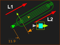 •Line 1 – L1 in the Base-Part- Drag up to the right •CAD-Line/Part 2 – L2 - Drag up to the right The Motion-Dimension is 11.9mm. If you Increase the Motion-Dimension value, you move the Slider up to the right. The small arrowhead shows the positive direction of the Slider. |
