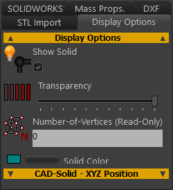 Show SOLID (check-box) Click the Show Solid check-box to show or hide the CAD-Solid that is on the CAD-Line. Note: Enable Visibility toolbar > Show Solids in Mechanisms to show CAD-Solids in Mechanism-Editors. Transparency: Drag the Transparency slider-bar to change the transparency of the CAD-Solid on the CAD-Line. Experiment! Solid color: Click the Solid Color button to open and edit the color of the CAD-Solid with the Windows® color picker, Number of Vertices: (read-only) Complex files have more vertices. MechDesigner may be slow to respond to new commands when there are many CAD-Solids, each with many Number-of-Vertices. How many is too many? Try to make Number-of-Vertices < 10,000. Experiment with the Fine, Coarse and Custom radio-buttons in the SOLIDWORKS tab. |