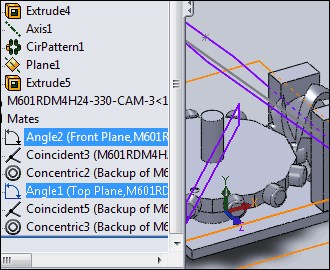 3.SOLIDWORKS® 'MATES' Here, we add mates (SolidWorks® terminology) that we want to control with motion-values from the MechDesigner model. The mates in the SolidWorks model are (see image): 1.Mate 1: ANGLE2 is between a Fixed and a Moving Plane in the 3D-Cam. The 3D-Cam rotates when we edit the value of Angle2. 2.Mate 2: ANGLE1 is between a Fixed and a Moving Plane in the Follower Turret. The Follower Turret rotates when we edit the value of ANGLE1. The two mates in the Feature Tree, are in the image to the left. The Cad Control Function-Blocks drive the mates Angle 2 and Angle1 . You can rename Mates in SolidWorks. |