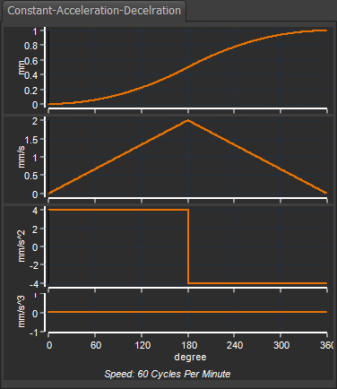 The Constant-Acceleration motion-law was used in the past because it has the lowest nominal acceleration of the Traditional Motion-Laws. However, it has at three points: at its start, end, and at its . This makes it a very poor choice form a dynamic-response viewpoint. Infinite-Jerk incites vibrations in any mechanical system. We do not recommend this motion-law if the is less than 10, or even 20.